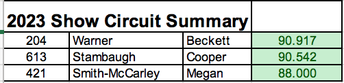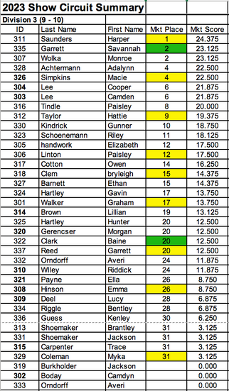​Raw scores are broken out by class and added together for a total of 150 points for each exhibitor.Â