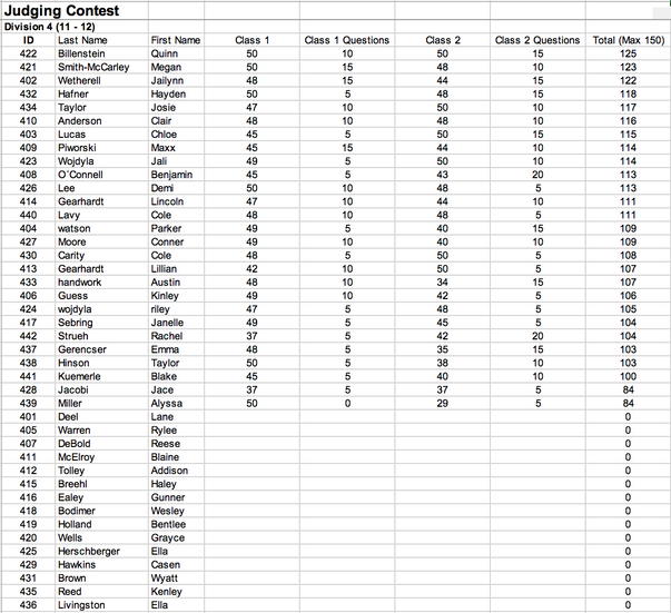 Exhibitors took a 30 question test based on their knowledge for their age division. Divisions 2-7 also had the opportunity to answer 5 tie-breaker questions.Â