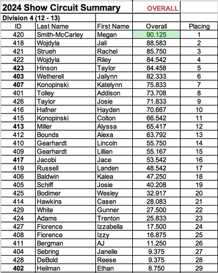 Here are the overall standings for each division. Each category is included in an exhibitor's overall score and no scores are dropped.