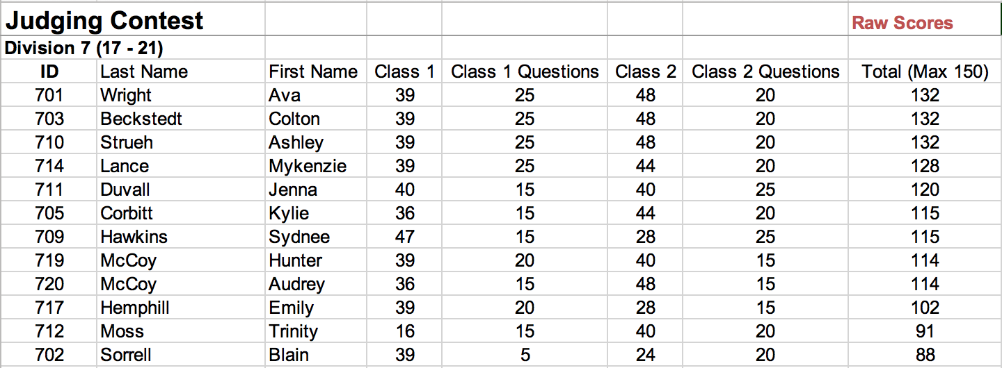 EX: If an exhibitor placed first in showmanship each day, received a first in a market or breeding class each day, aced the skill-a-thon, and had a perfect score on the judging contest, they would have a weighted score of 100.