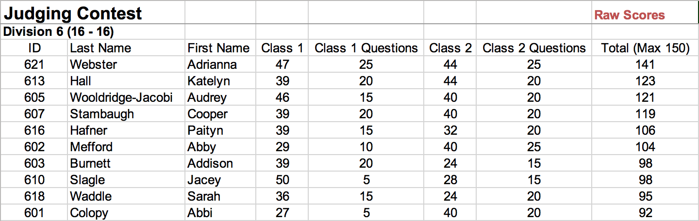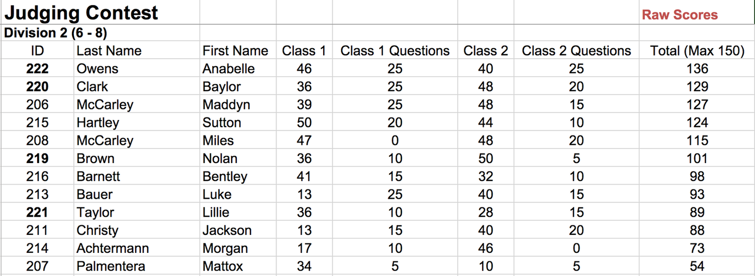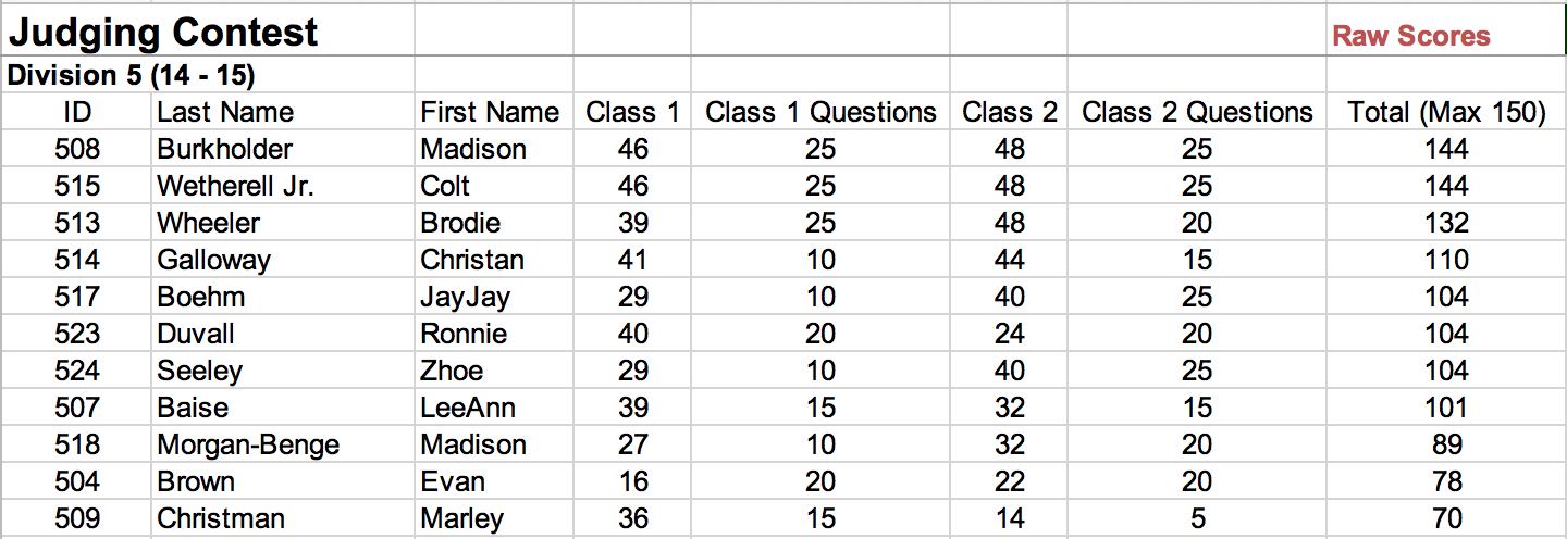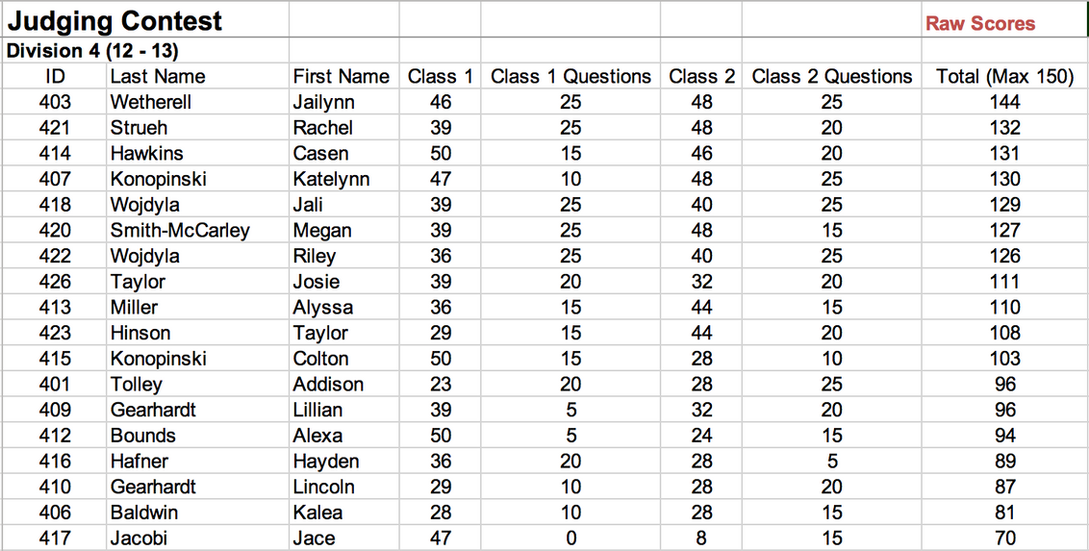 Exhibitors took a 30 question test based on their knowledge for their age division. Divisions 2-7 also had the opportunity to answer 5 tie-breaker questions.Â