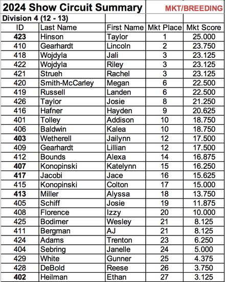 Here are the standings for market/breeding. This calculation takes the exhibitor's highest placing animal (one) of the day, regardless of market or breeding. Exhibitor's are not given extra points if their animal is named a breed champion or reserve or is in the top 5 of their respective division.