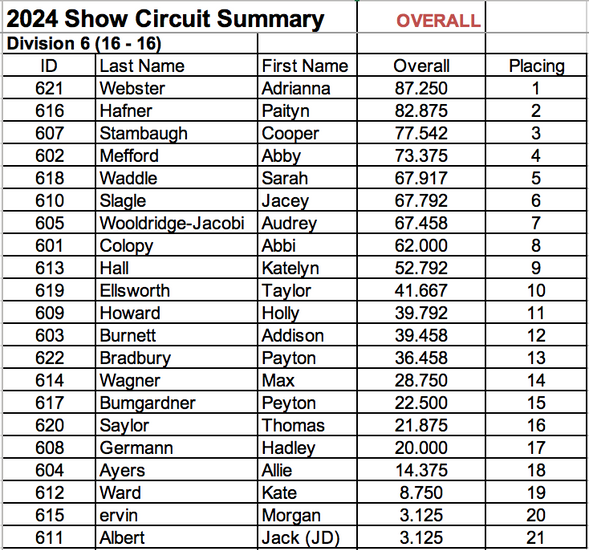 The 2024 Buckeye Show Circuit participants have been split in to divisions by age as of January 1, 2024.Â