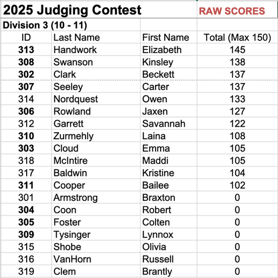 Exhibitors took a 30 question test based on their knowledge for their age division. Divisions 2-7 also had the opportunity to answer 5 tie-breaker questions.Â